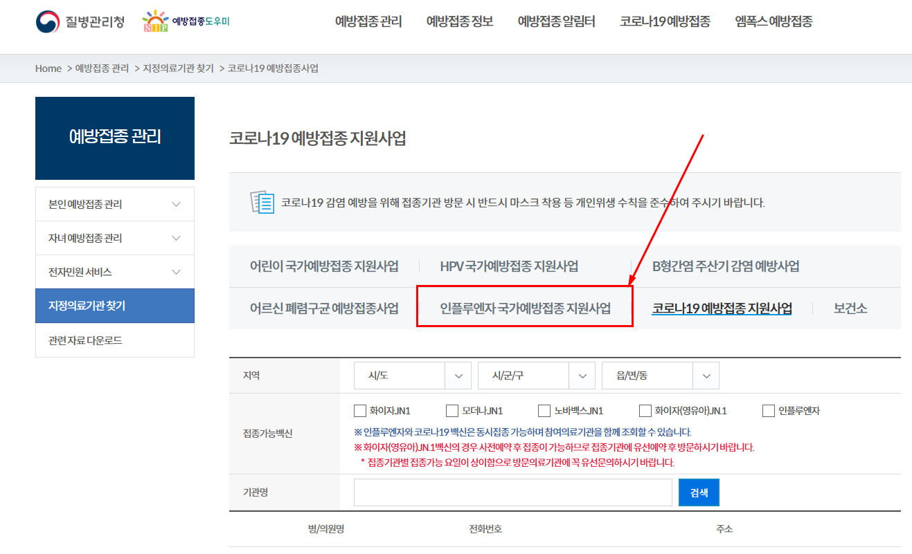 3. '인플루엔자 국가예방접종 지원사업' 선택