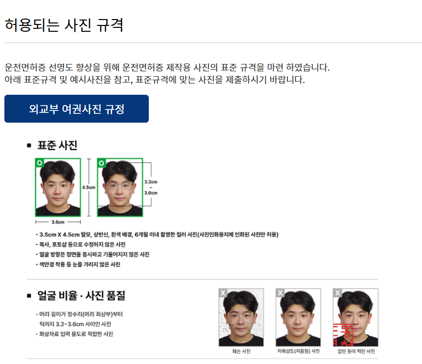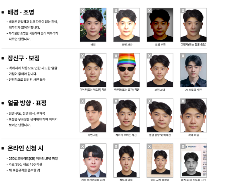 항목규격크기 3.5cm × 4.5cm 배경 흰색 촬영 시기 6개월 이내 얼굴 정면, 무표정 안경 착용 가능 (반사·테두리 가림 불가) 모자 착용 불가 ⚠️ 셀카, 스냅사진, 보정 과한 사진은 반려 가능