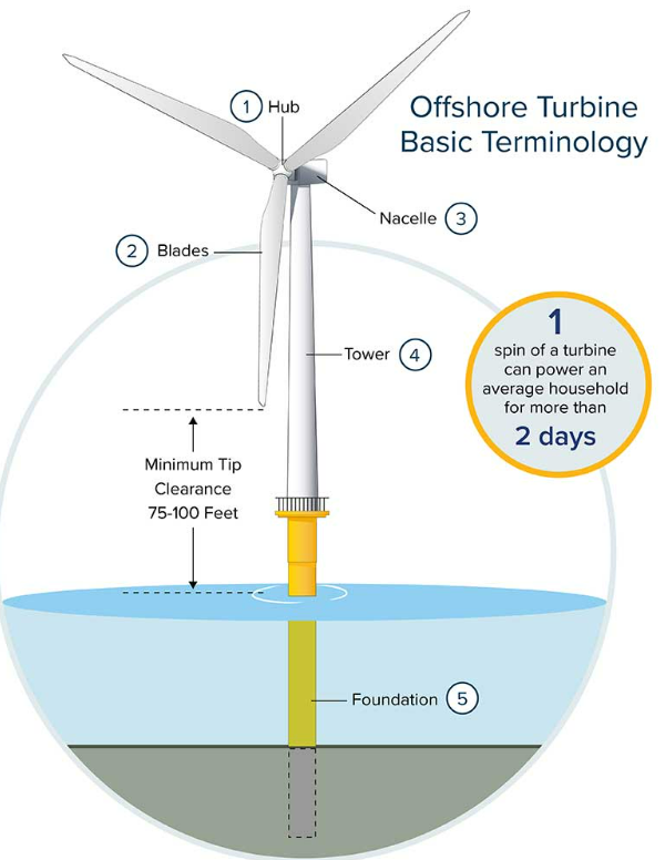 추가적으로 블레이드와 기준점의 Clearance도 고려해야 합니다. 이 높이에 대해서는 국내외 에는 정해진 규정은 없습니다. 하지만 일반적으로 터빈의 진입 및 작업이 가능한 높이롤 고려해야 합니다. 육상풍력에서는 나무가 자라는 높이등을 고려하여 20m이상의 간격을 두었습니다. 해상풍력에서는 Davit Crane의 운영 반경 등을 고려하여 30m 정도의 간격을 두는것이 일반적입니다.